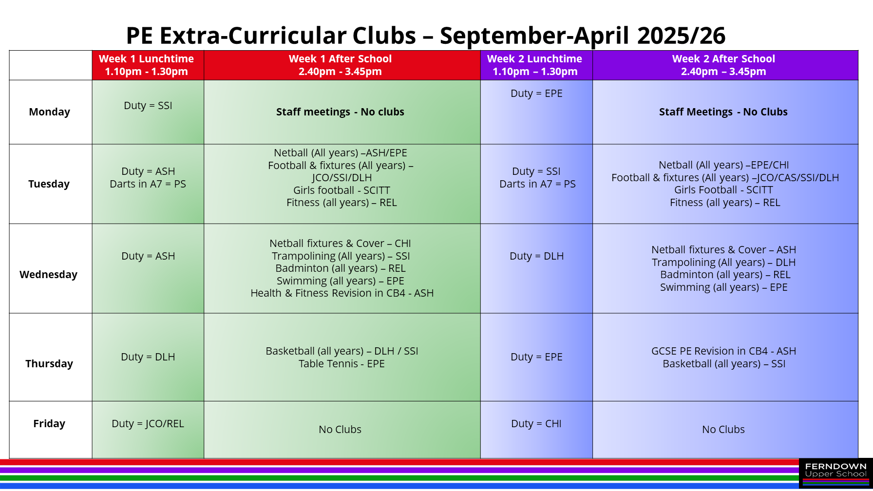 The Ferndown Upper School PE department promote a healthy active lifestyle and aim to build character and positive attitudes, improving self-esteem and self-confidence, giving our students new skills to enable them to make a positive contribution inside and outside of school in a safe and enjoyable environment through the vehicle of Physical Education. Our program of study and fantastic facilities allows us to provide not only a stimulating, rich and challenging curriculum, but also a diverse one, which will give our pupils the opportunity to develop communication, teamwork and other leadership skills needed for future employment.