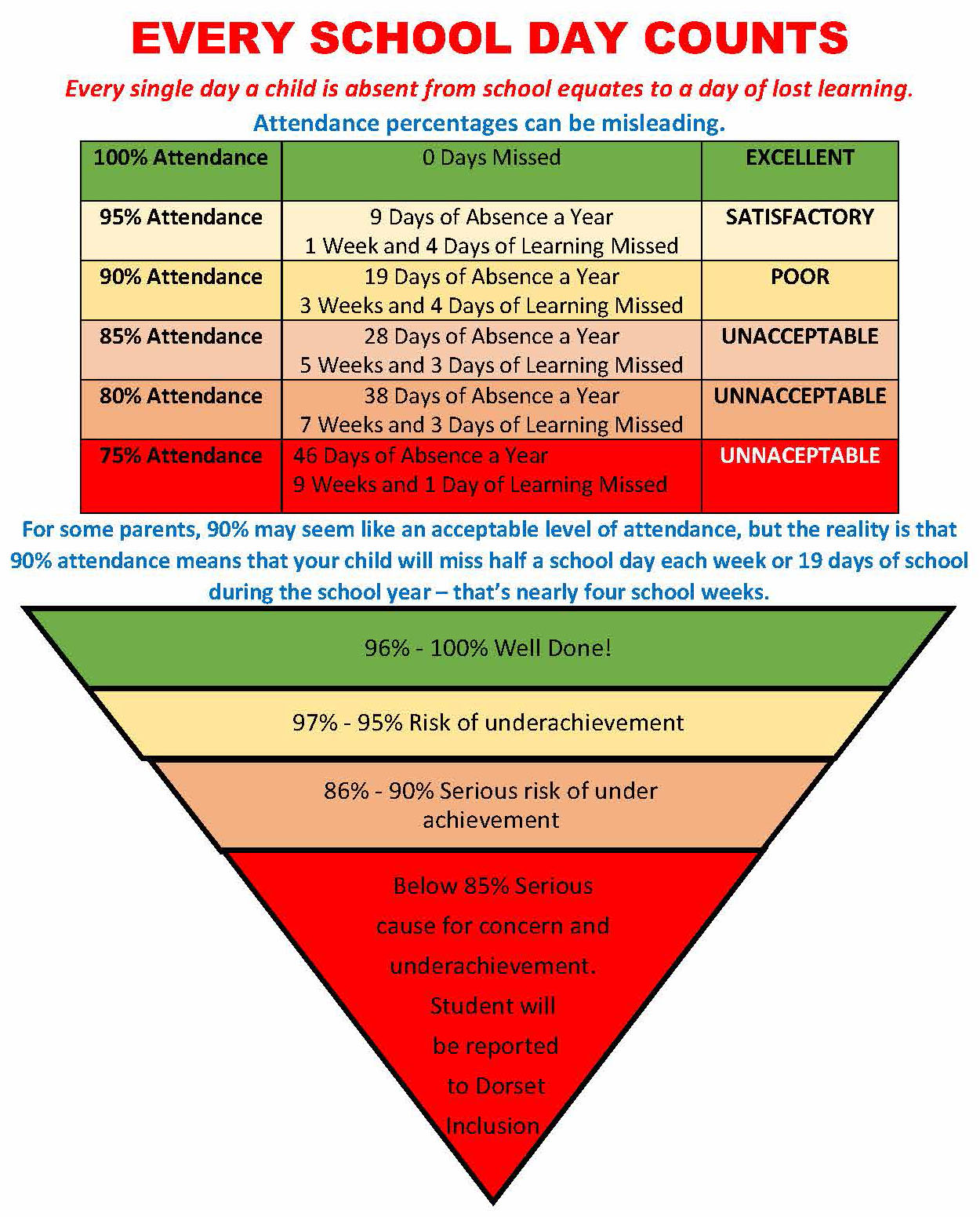 - Stage A5 – If there is no improvement within 2 weeks, then we will send you a further letter to invite you to a meeting with our Pastoral Managers and our Attendance Officer to discuss the circumstances around the student’s absence and what support we are able to offer. At this point it is expected of the school to report the student’s attendance figures to Dorset County Council.