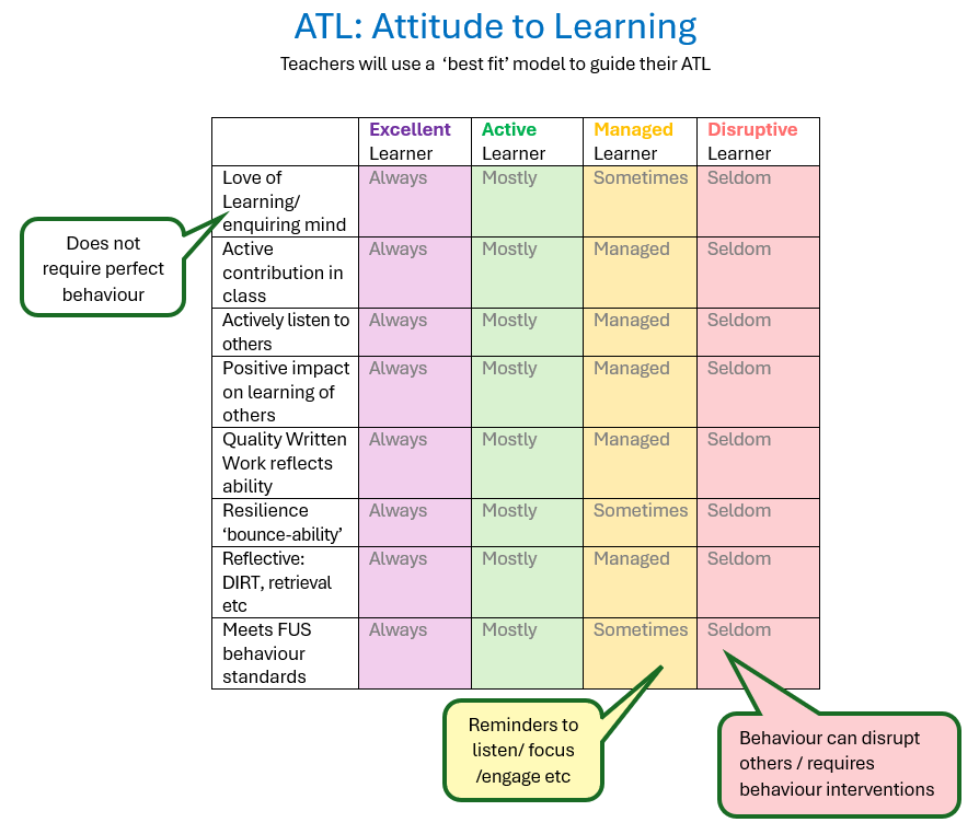- When reporting our half termly Attitude to Learning, ATL assessment teachers use the following grid to develop an overall ATL score for your child. We call this a ‘Best Fit’ model.