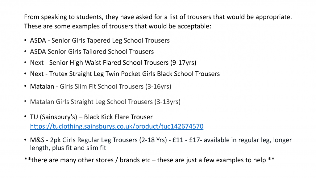 -Black School Trousers must be regular fit – not skinny leg – trousers must not cling to the knee. No leggings or jeans material.