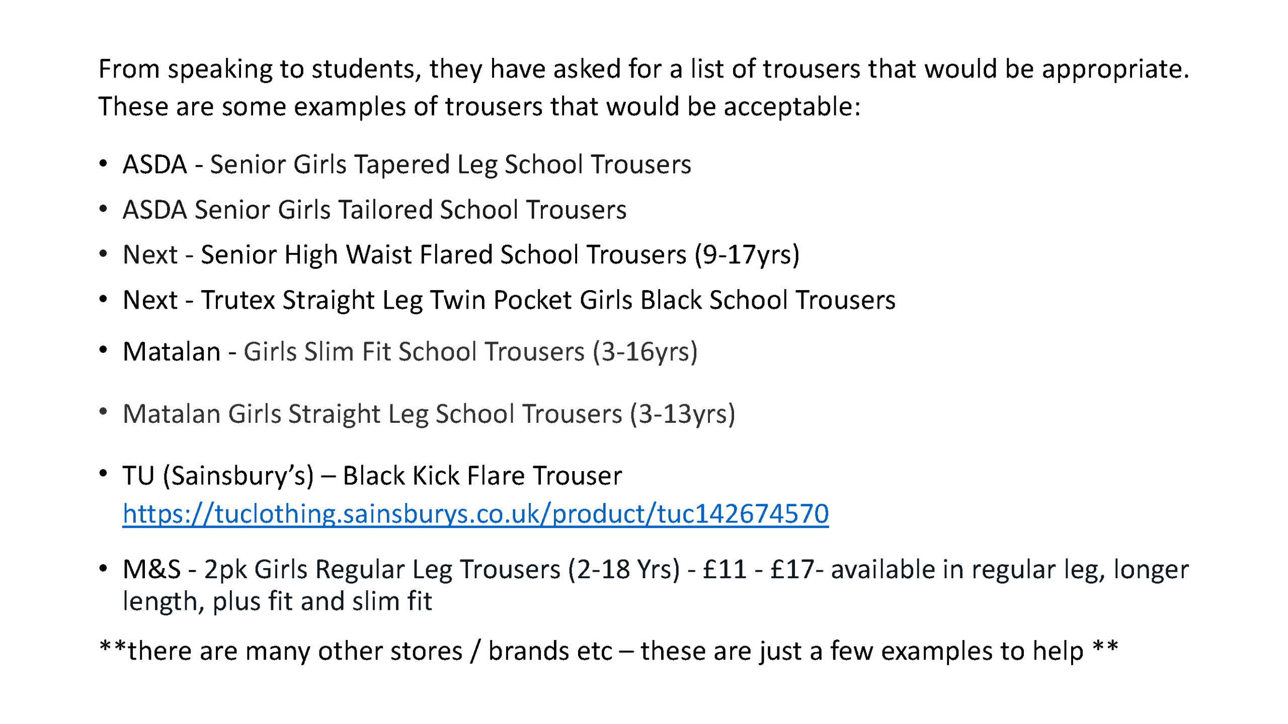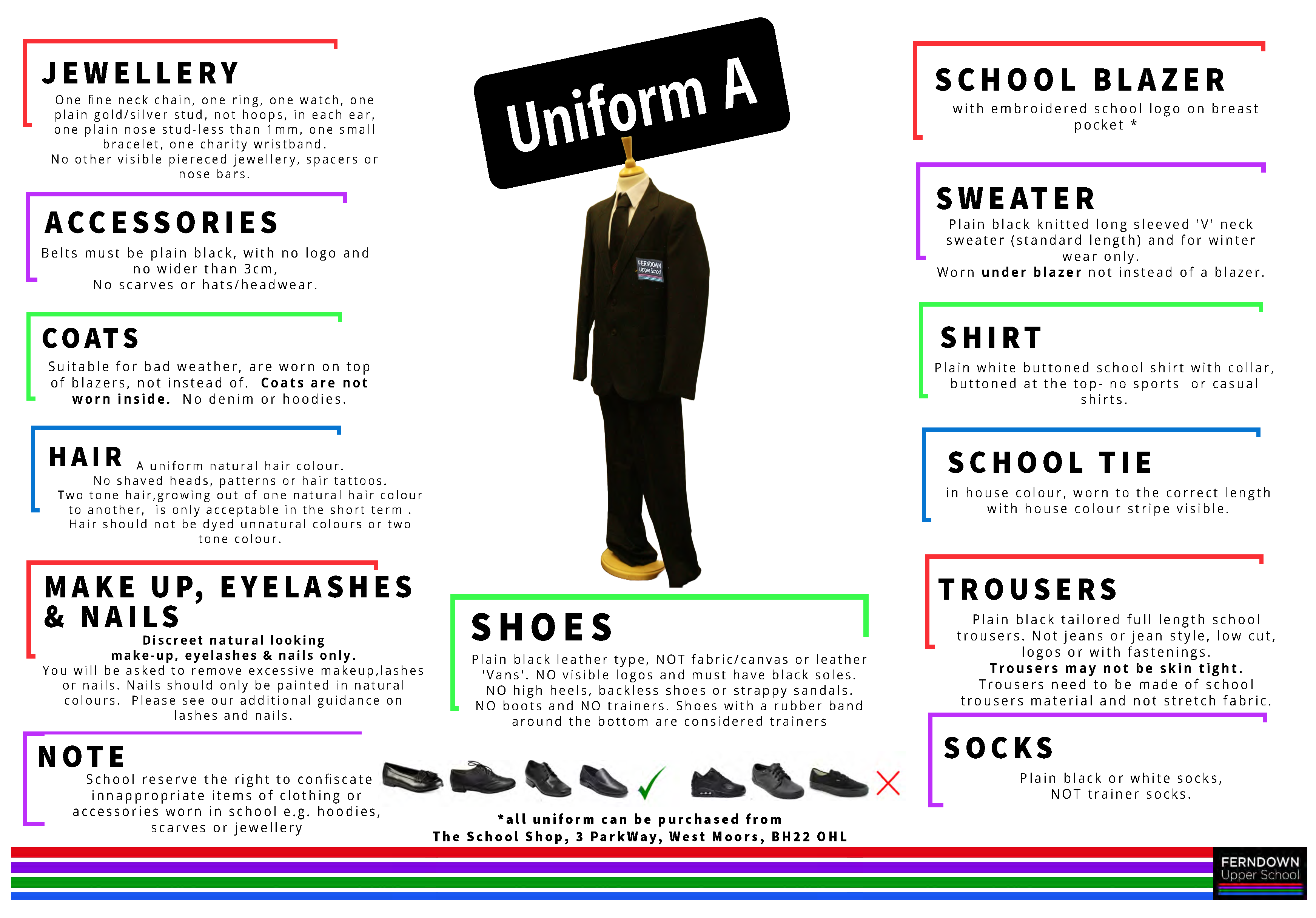 Non-branded uniform may be purchased from stores such as Asda, TU Clothing, Matalan, M&S. This must follow the guidelines: